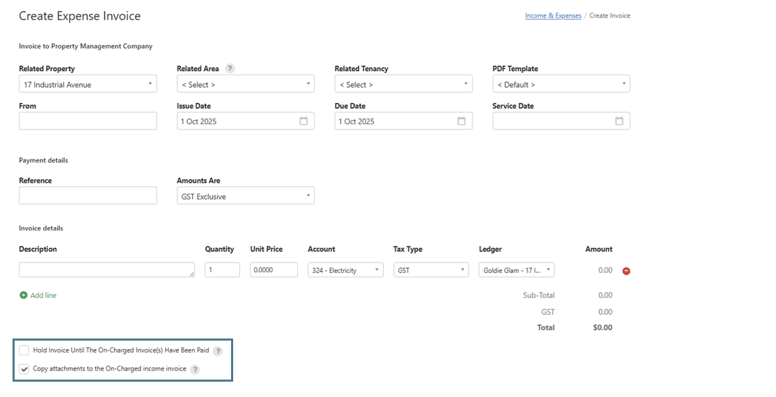 - Fill in the necessary details of the expense invoice. If the account selected is associated with a direct on-charge for the specified property, an option to create on-charge invoices for tenants will appear.