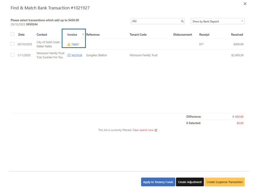 - During reconciliation, after the actual funds have been received, use the 'gold coins' icon under the Invoice heading to match the refund amount with the appropriate transaction.