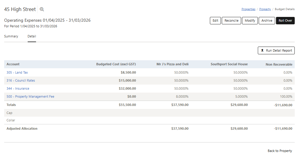 - An itemized view of how much income is forecasted to be allocated to each tenancy for specific budget items.