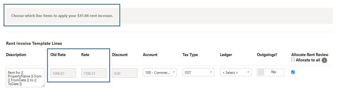 Allocating a Rent Review increase means deciding which lines on your Rent Template will be adjusted to reflect the new rent amounts after a review: