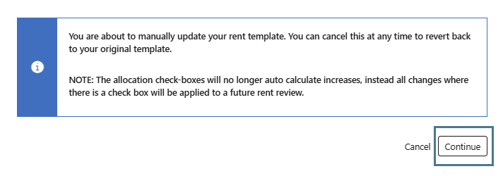 You are about to manually update your rent template. You can cancel this at any time to revert back to your original template.