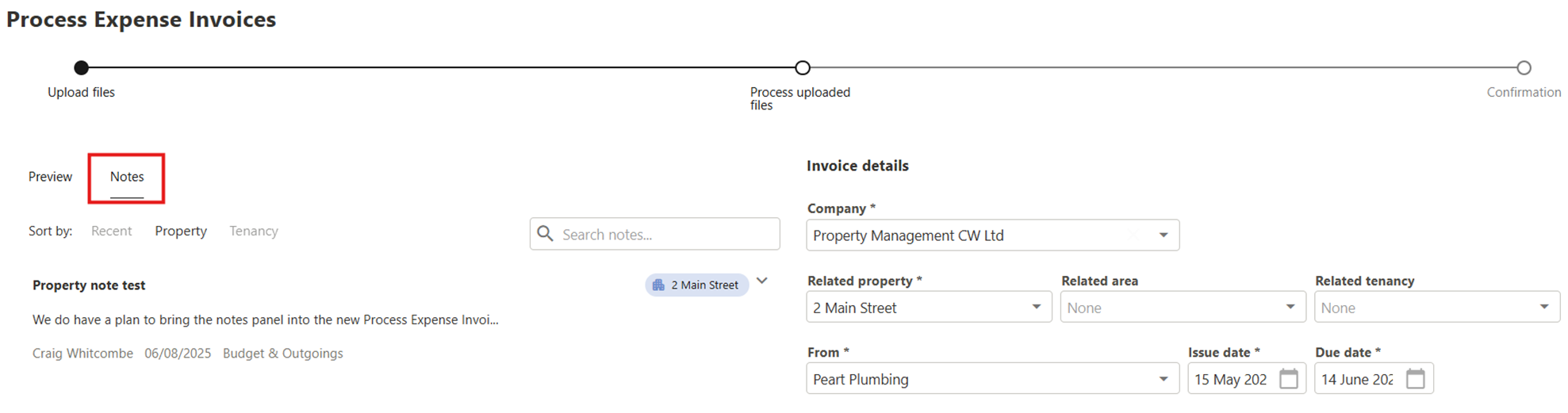 Notes can be used to reference when processing expense invoices. To view notes, click the Notes tab in the preview window.