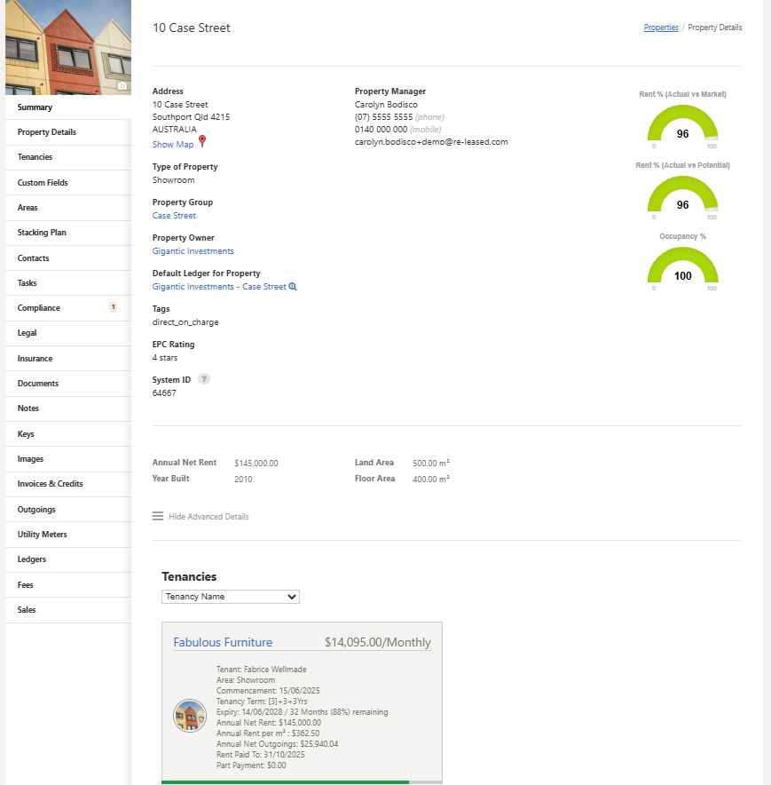 - The Summary tab will open by default, presenting a snapshot of key property and current tenancy information.