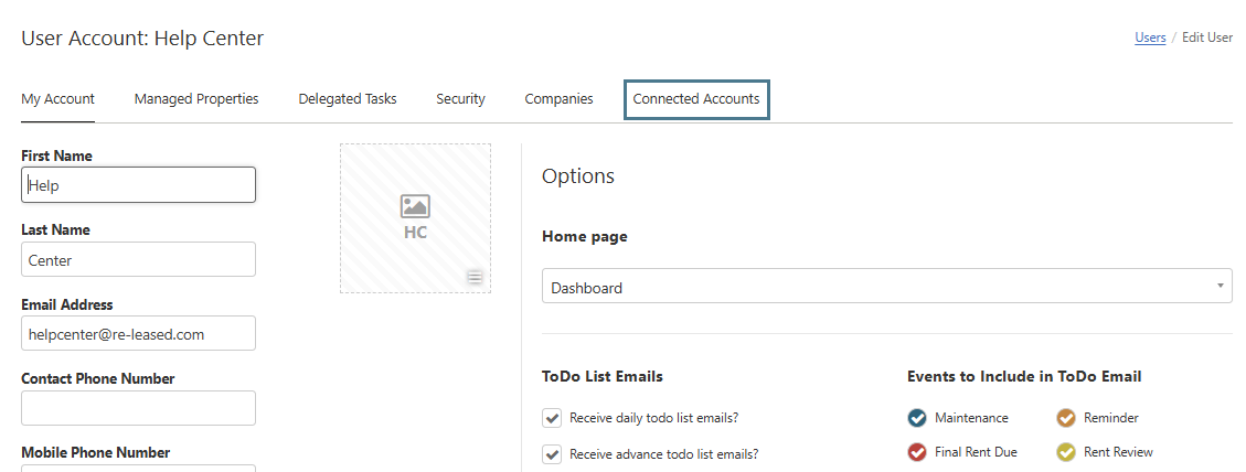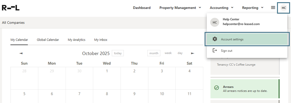 - Go to your user Account settings in Re-Leased, by clicking on your initials in the top right corner of the page.