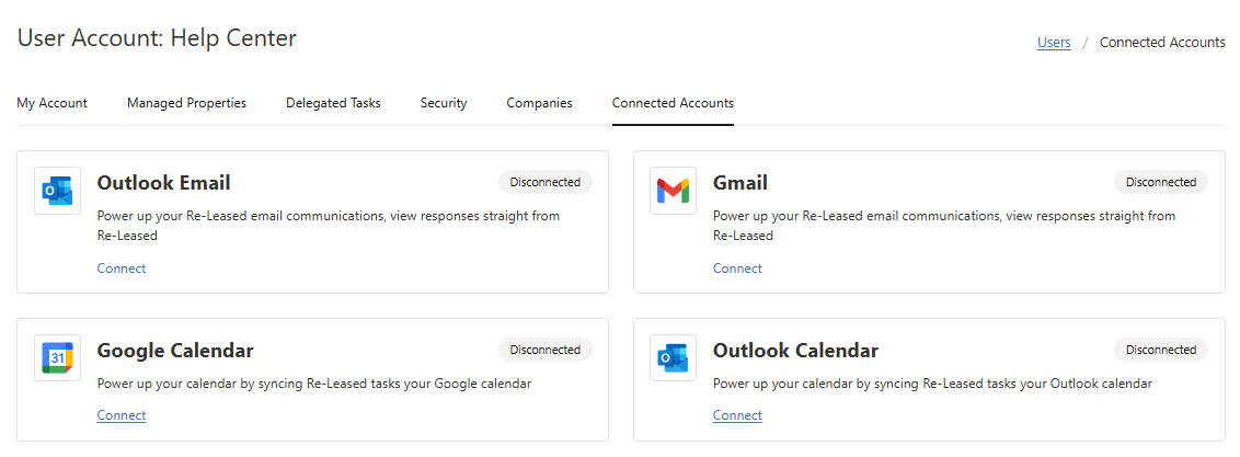 - Choose Connect on the calendar app you would like to link with Re-Leased.