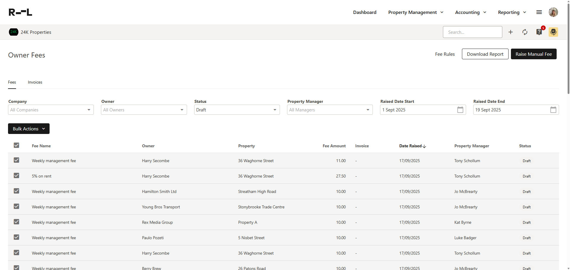In the Fees tab, you can review all draft fees awaiting your decision. Use the available filters to organize fees by company, owner, status, property manager, and date ranges. Select individual fees using the checkboxes on the left side of each row to prepare them for bulk actions.