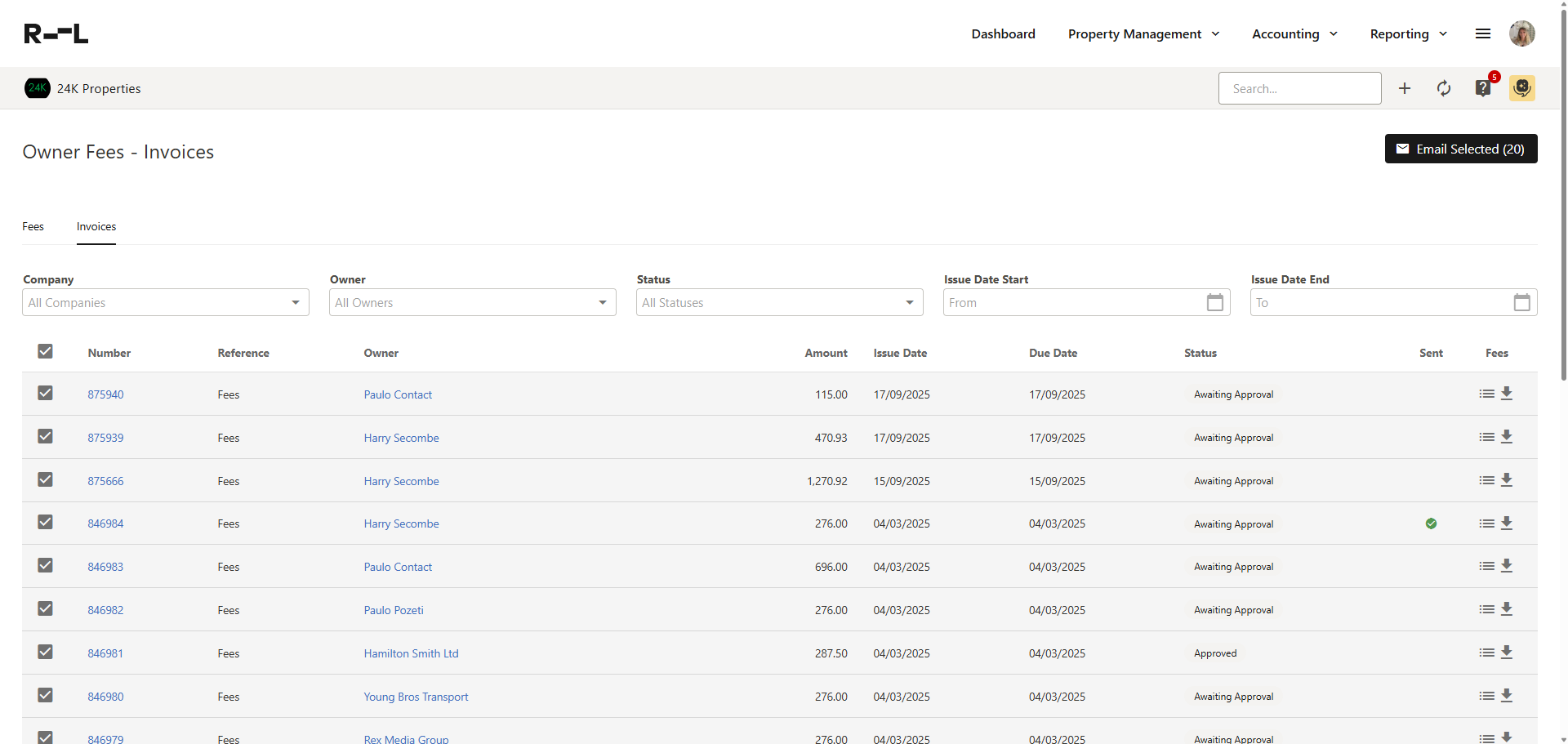 To maximize efficiency with the owner fee system, regularly review and process draft fees to maintain current records. Use the bulk actions strategically - waive inappropriate fees promptly and generate invoices for legitimate charges in batches. Take advantage of the bulk email functionality to maintain consistent communication with property owners.