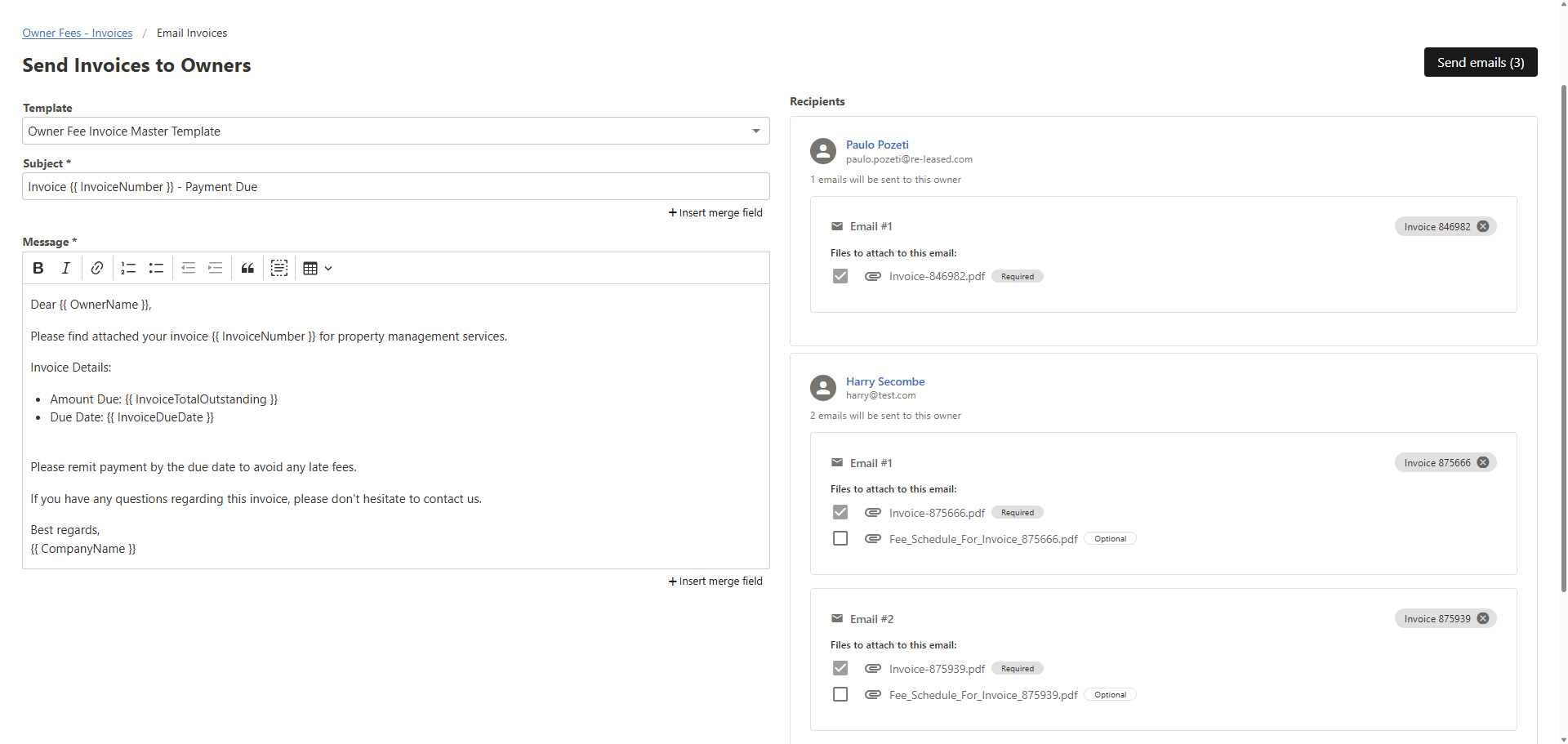 For each email, the system automatically attaches the required invoice PDF. Additionally, the optional Fee Schedule PDF can be included or excluded based on your preference. These attachments provide owners with detailed information about their fees and support transparent communication.