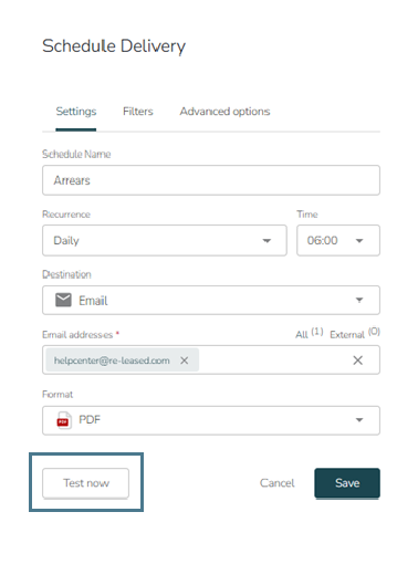 Before finalizing, you can send a test delivery to yourself by selecting Test now. Once satisfied, save your schedule, and it will automatically send reports as configured. You can later return to edit, duplicate, or delete schedules as needed.