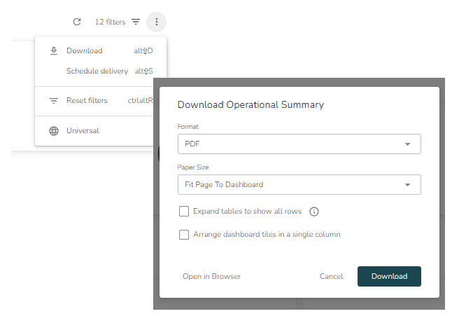 You can download full dashboards in PDF and CSV formats, or singular tiles in a choice of TXT, Excel, CSV, JSON, HTML, Markdown, or PNG formats.