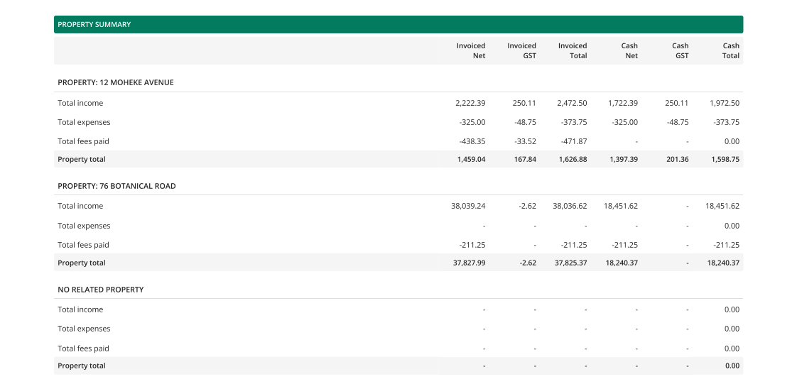Individual property summaries follow, showing the financial performance of each specific property. Each property displays its own totals for invoiced amounts, GST, cash positions, and balances. Additionally, a "No Related Property" summary captures any transactions that aren't linked to a specific property, ensuring complete financial transparency.