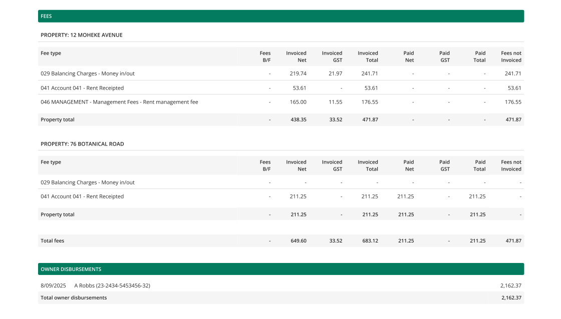 Management fees and charges are grouped by property and fee type, providing clear visibility into the costs associated with each property's management. This includes: