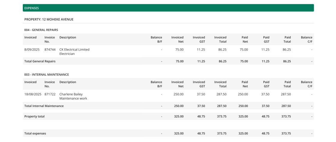 Expenses are organized by property and further categorized by chart of account codes. This detailed breakdown helps owners understand where their money is being spent across different properties and expense categories. The section displays:
