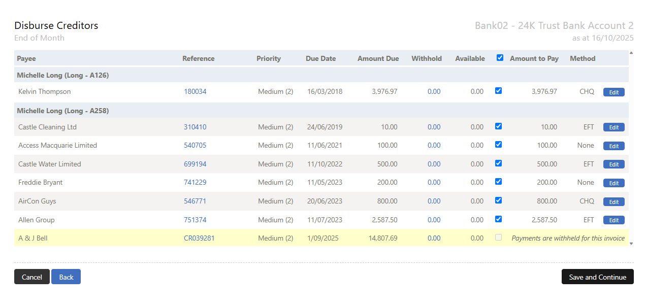 Withheld invoices remain in the system but cannot be selected during the disbursement process, giving you complete control over payment timing.