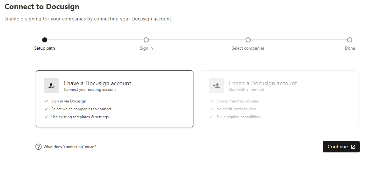 Once you have completed the Docusign sign-in, select one or more companies to connect an existing Docusign subscription.