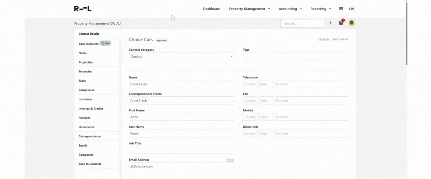 - The correspondence name for the Contact and the contact approval status (e.g. 'Approved', 'Awaiting approval')