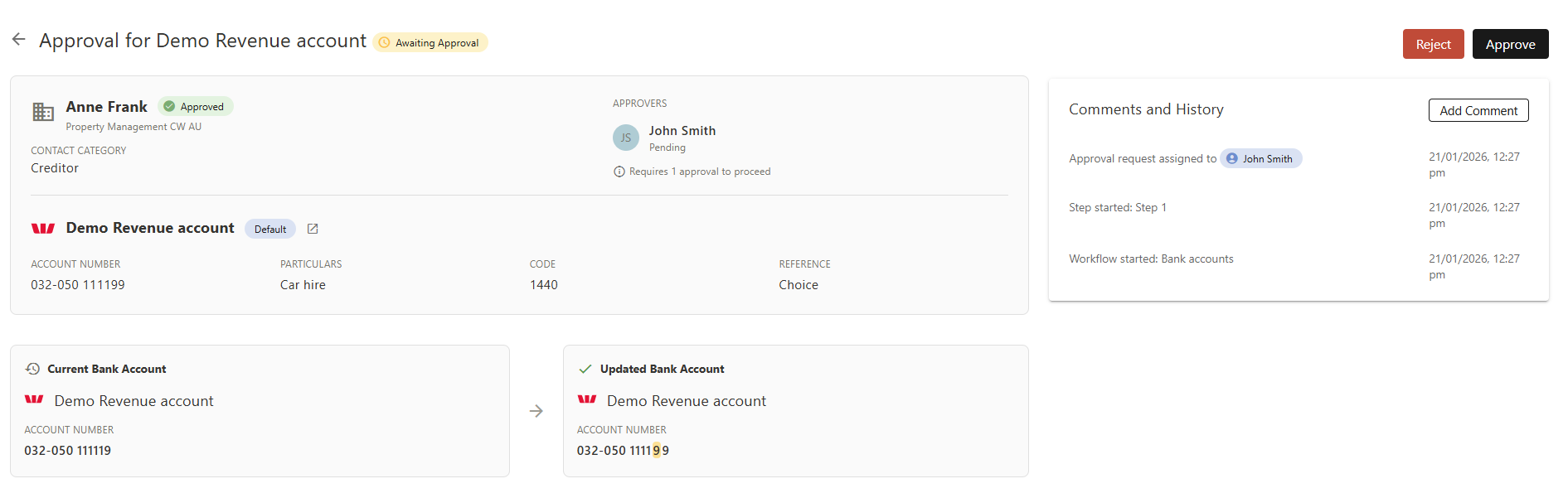 Connected Accounting customers: When a bank account is in 'Awaiting Approval' status, updates will NOT sync to your external accounting system (e.g. Xero) until the change has been approved. This prevents payments from being made to unverified bank accounts. Once approved, the bank account details will sync on the next scheduled sync.