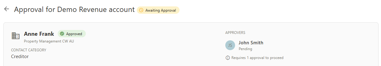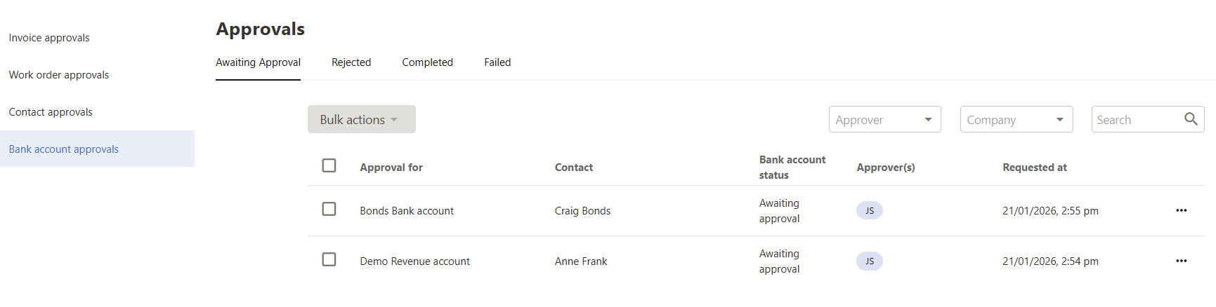 Important: If a user has the 'Can approve bank accounts' permission, they can approve any bank account change, including those queued in "Awaiting Approval", bypassing your defined approval process.
