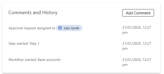 Every approval action is logged in the Comments and History section of the bank account, including: