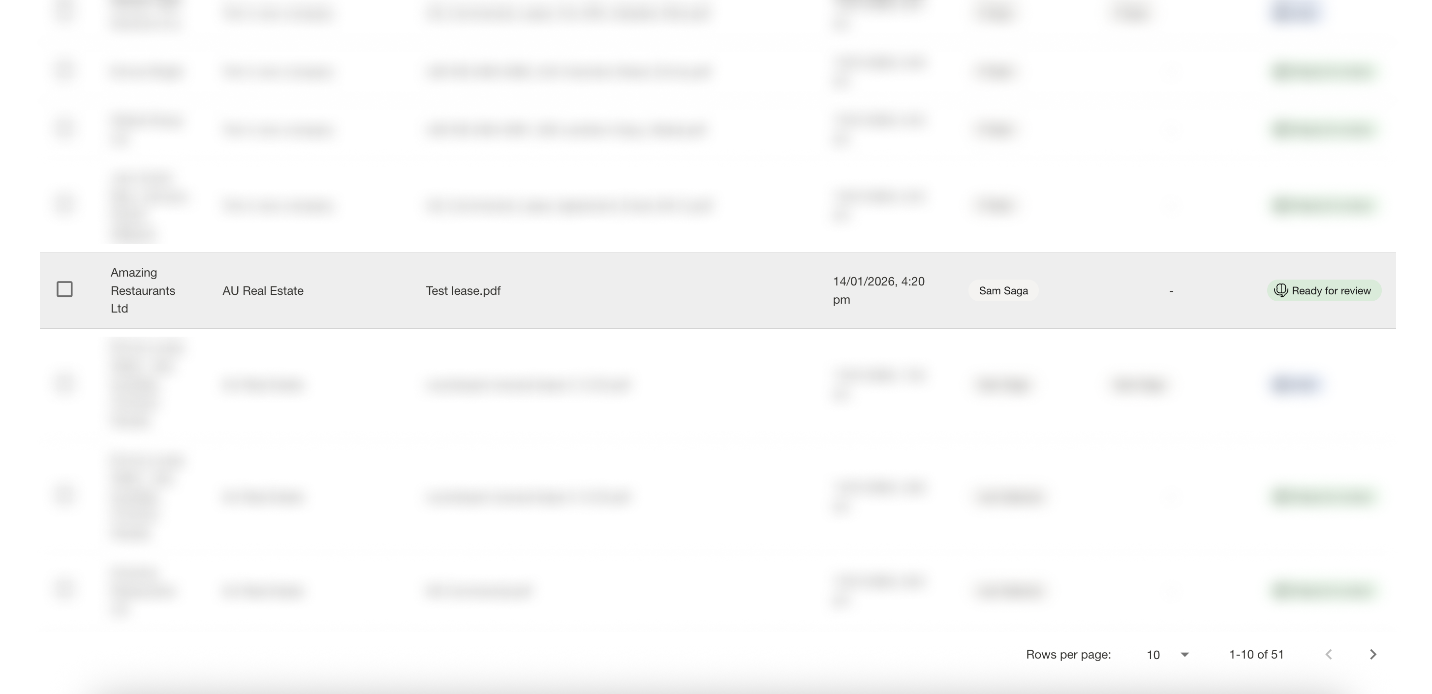 Credia Lease Extraction automatically reads your lease documents and populates the lease information for you. Upload your lease and any additional documents (PDF), and Credia extracts tenant names, rent amounts, dates, and other details. All you need to do is review the extracted data, make any necessary adjustments, and save.