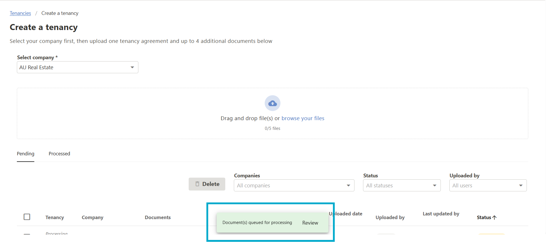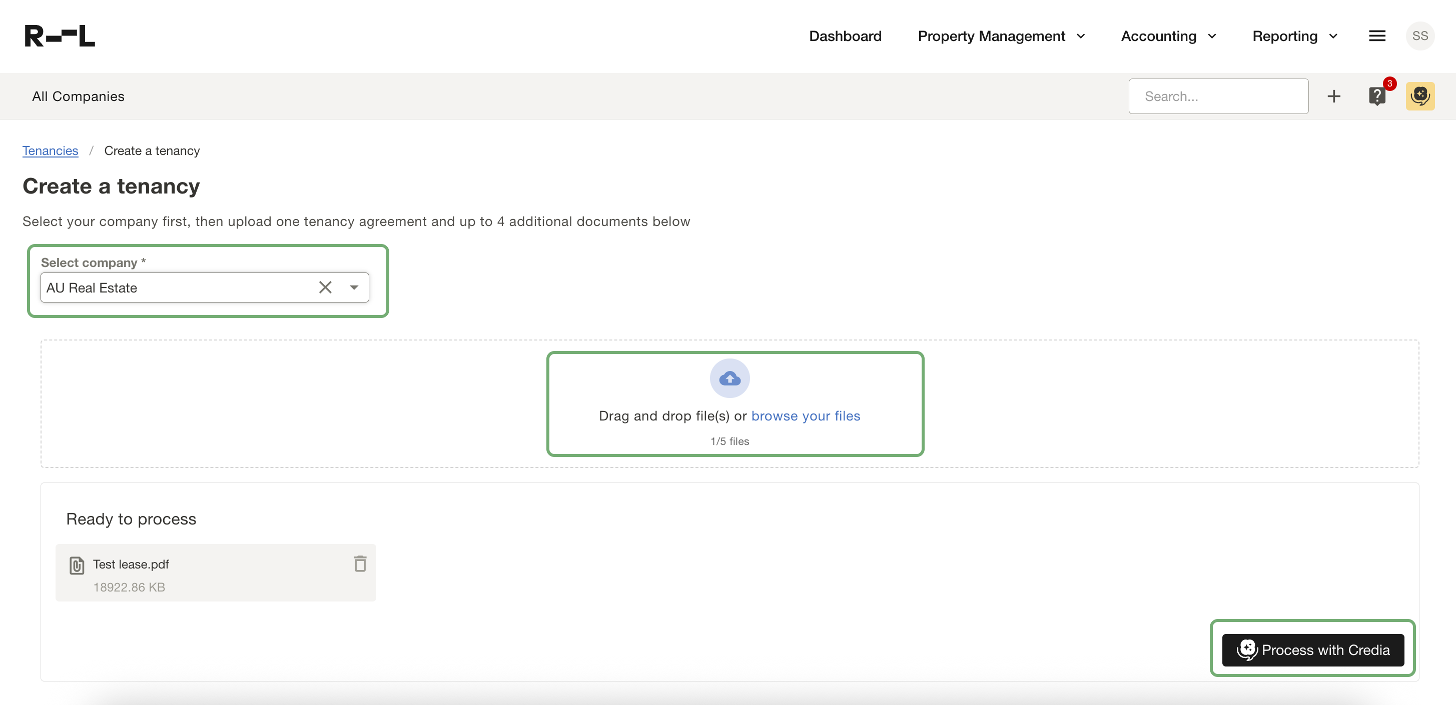 Important: Only upload documents for a single lease. Credia cannot create multiple tenancies from one upload, but we're working on adding this capability.