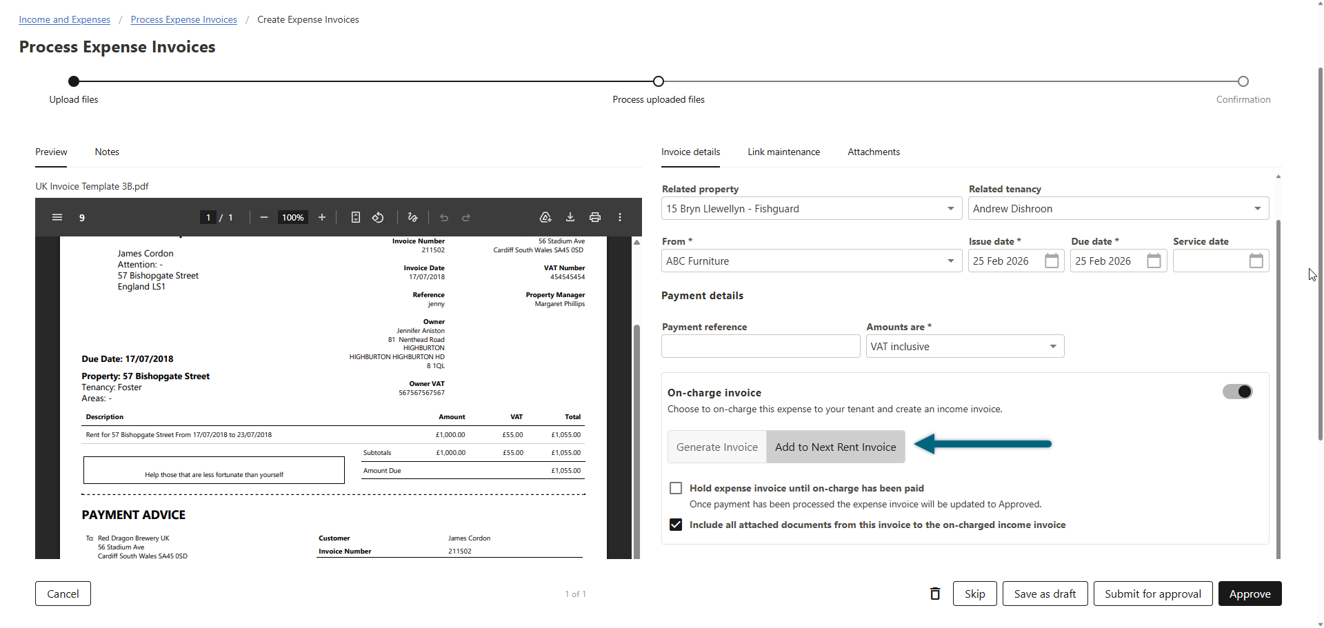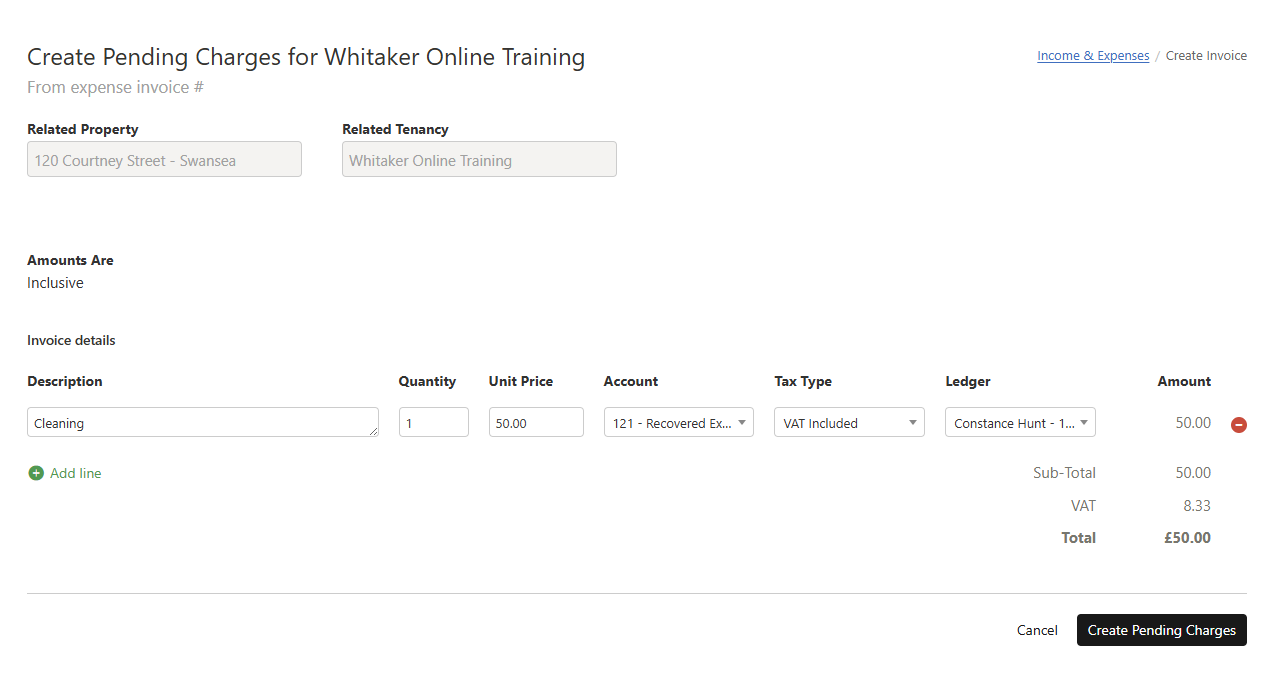 - Go to Income & Expenses and open or process the expense invoice you want to on-charge, then allocate the charge to the relevant tenancy and choose Defer on-charge to next rent invoice and save the invoice.