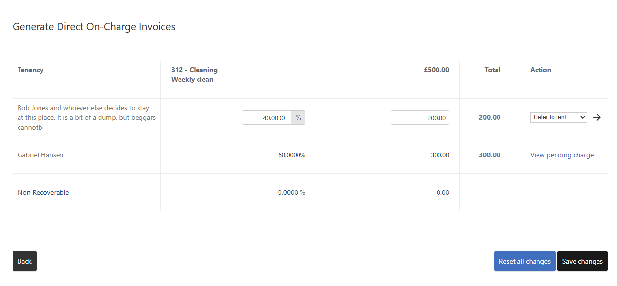 - Non-recoverable portions of a direct on-charge do not show an action dropdown — only tenant-allocated amounts can be deferred.
