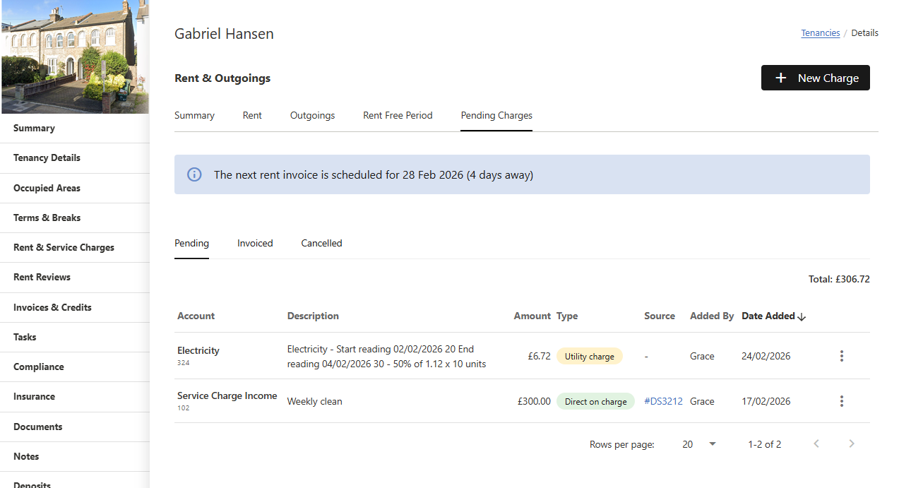 From a property: Open the property, then in the property menu (sidebar) click Pending Charges. You will see all pending charges for that property. Use the dropdown to filter by All tenancies or a specific tenancy. The total shown updates with your filter. From this page you can edit, or cancel charges in the same way as on the lease tab.