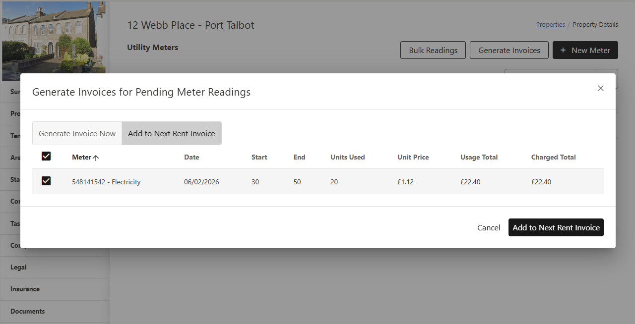 - In the Generate Invoices for Pending Meter Readings modal, choose the Add to Next Rent Invoice option (the other option is Generate Invoice Now).