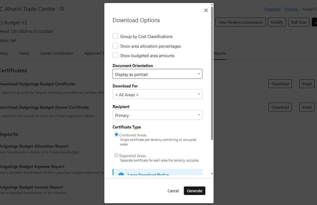 If your tenants occupy more than one area within a budget, you can now generate a single consolidated budget certificate and budget statement per tenancy — rather than receiving a separate document for each area. This makes it easier for tenants to understand their total obligations, and reduces the number of documents you need to manage and distribute.