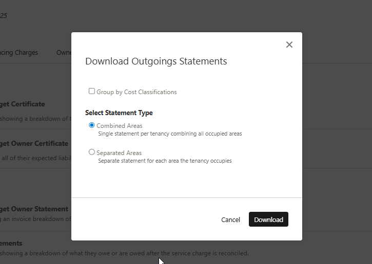 Budget statements follow the same consolidation approach. When you click Download Outgoings Statements, the Download Outgoings Statements modal includes a Select Statement Type setting with two options: